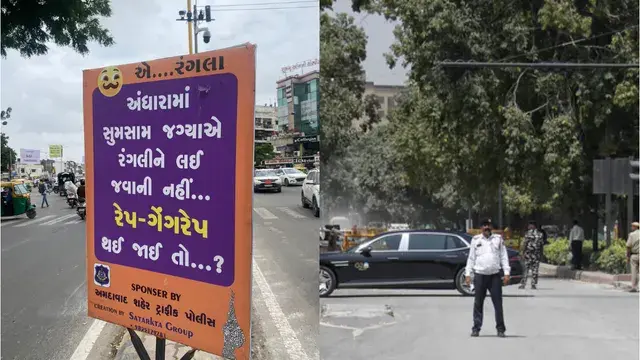 ये पोस्टर शहर के सोला और चांदलोदिया की सड़कों पर रोड के डिवाइडर्स पर लगे हैं। इसमें लिखा है ” देर रात पार्टियों में न जाएं, आपका रेप या गैंग रेप हो सकता है।” और “अपनी दोस्त के साथ अंधेरे में या सूनसान इलाकों में न जाएं, अगर उसका रेप या गैंगरेप हो जाए तो क्या होगा?”