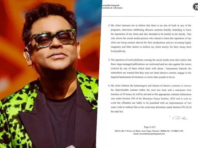 एआर रहमान ने एक्स पर चार पन्नों के कानूनी नोटिस को शेयर किया है जिसमें लिखा है, “मेरे क्लाइंट एआर रहमान के निर्देश पर मैं संबंधित लोगों को नोटिस जारी करता हूं। मेरे क्लाइंट ने कुछ दिन पहले अपने एक्स के माध्यम से तलाक के बारे में सूचित किया।