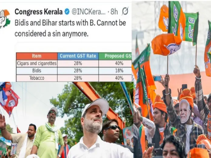 भारतीय जनता पार्टी (भाजपा) ने कांग्रेस की केरल इकाई के एक पोस्ट को लेकर शुक्रवार को विपक्षी पार्टी पर जमकर निशाना साधा। केरल कांग्रेस ने एक ट्वीट में हाल में जीएसटी रिफॉर्म का जिक्र करते हुए भाजपा पर तंज कसने की कोशिश की थी। हालांकि, इस पोस्ट में बिहार और बीड़ी की तुलना करना केरल कांग्रेस के लिए महंगा पड़ गया। भाजपा सहित एनडीए के नेताओं ने इसे सीधे-सीधे बिहार का अपमान करार दिया।
