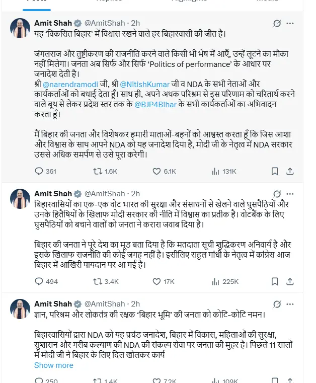 अमित शाह ने अपने बयान में कहा कि जंगलराज और तुष्टीकरण की राजनीति करने वालों को प्रदेश की जनता ने स्पष्ट संदेश दे दिया है। उन्होंने कहा, अब बिहार का मतदाता केवल कामकाज और प्रदर्शन के आधार पर जनादेश देता है। उन्होंने प्रधानमंत्री मोदी, मुख्यमंत्री नीतीश कुमार और एनडीए के सभी नेताओं व कार्यकर्ताओं को बधाई दी। साथ ही भाजपा के बूथ से लेकर प्रदेश स्तर तक के हर कार्यकर्ता का आभार व्यक्त किया, जिन्होंने नतीजों को जमीन पर उतारने में मेहनत की।