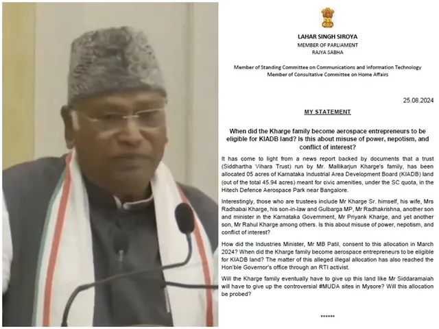 सिरोया ने सवाल किया है कि उद्योग मंत्री एमबी पाटिल ने कैसे मार्च 2024 में इस आवंटन के लिए सहमति दी? खड़गे परिवार कर्नाटक औद्योगिक क्षेत्र विकास बोर्ड की भूमि के पात्र होने के लिए एयरोस्पेस उद्यमी कब बन गया?