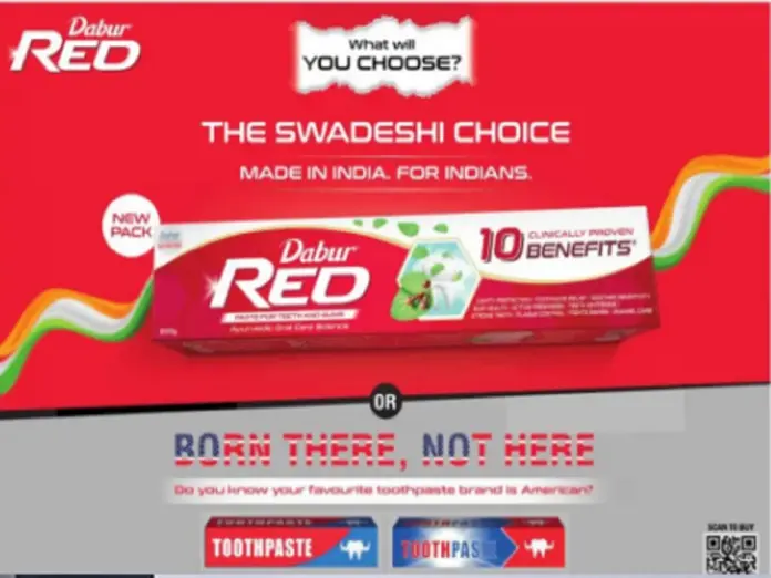 समाचार एजेंसी रॉयटर्स की एक रिपोर्ट के अनुसार 11 अरब डॉलर की वैल्यू वाली कंपनी डाबर ने इस हफ्ते अखबारों के पहले पन्ने पर एक विज्ञापन दिया, जिसमें कोलगेट पैकेजिंग जैसे दिखने वाले टूथपेस्ट पैक की तस्वीरें थीं। कंपनी ने अपने प्रतिद्वंद्वी का नाम लिए बिना विज्ञापन में कहा कि भारत का पसंदीदा टूथपेस्ट ब्रांड अमेरिकी है, और डाबर ‘स्वदेशी’ विकल्प है।