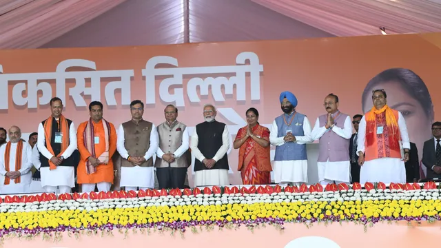 रेखा गुप्ता ने दिल्ली के रामलीला मैदान में शपथ ग्रहण की। इस दौरान पीएम मोदी, भाजपा शासित राज्यों के मुख्यमंत्रियों और उपमुख्यमंत्रियों समेत पार्टी के शीर्ष नेता मौजूद रहे। रेखा गुप्ता के साथ में छह मंत्रियों ने शपथ ली। इनमें परवेश वर्मा, कपिल मिश्रा, आशीष सूद, मनजिंदर सिंह सिरसा, पंकज कुमार, रविंदर इंद्रजार सिंह शामिल हैं।