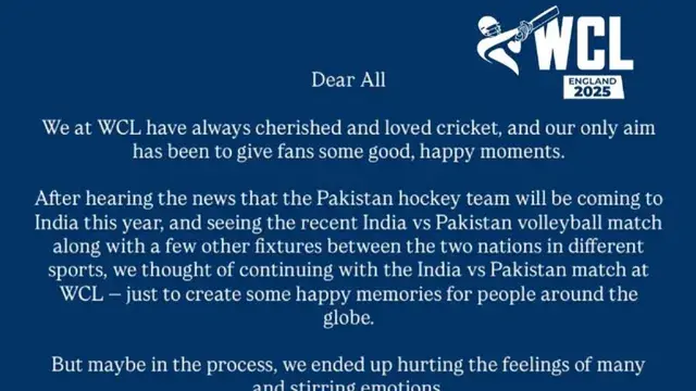 भारत-पाकिस्तान के बीच मुकाबले के आयोजकों ने स्वीकार किया कि इस घोषणा से कई लोगों की भावनाएं आहत हुईं। मुकाबले के रद्द होने की पुष्टि करते हुए डब्ल्यूसीएल ने कहा हमें इसके लिए खेद है और असुविधा के लिए माफी मांगते हैं।