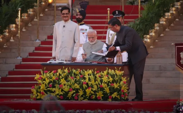 नई दिल्लीः पीएम नरेंद्र मोदी रविवार को लगातार तीसरी बार प्रधानमंत्री पद की शपथ ली। शाम 7:15 बजे राष्ट्रपति भवन में राष्ट्रपति द्रौपदी मुर्मू उन्हें पद एवं गोपनीयता की शपथ दिलाई। उनके साथ भाजपा के कई नेता और एनडीए से सहयोगी दलों के कई सांसदों ने भी मंत्री के रूप में शपथ ली। तीसरी बार प्रधानमंत्री पद की शपथ लेने वाले नरेंद्र मोदी देश के पहले पीएम जवाहरलाल नेहरू की बराबरी कर ली।