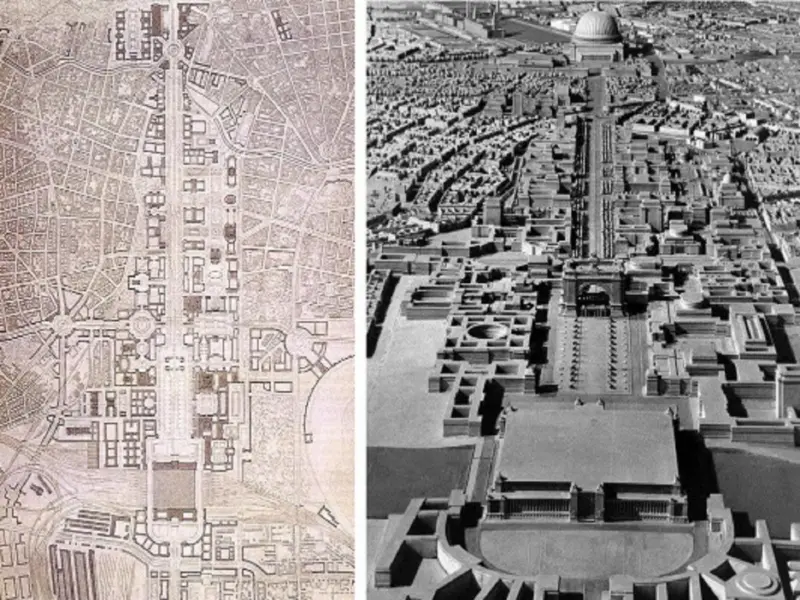 हिटलर ने बर्लिन को फिर से खड़ा करने का सपना देखा था। उसका इरादा था कि जर्मनी की राजधानी को एक नई वैश्विक राजधानी बनाया जाए, जिसे वह “जर्मानिया, विश्व राजधानी” कहता था। इस योजना के तहत बर्लिन के बड़े हिस्से को पूरी तरह तोड़कर फिर से बनाया जाना था। ब्लॉक दर ब्लॉक और मोहल्ला दर मोहल्ला गिराकर वहाँ चौड़ी सड़कें, विशाल चौक (plaza) और ऐसे खुले मैदान बनाए जाने थे जहाँ आम जनता की ताक़त और नाज़ी सेना की शक्ति का प्रदर्शन किया जा सके।