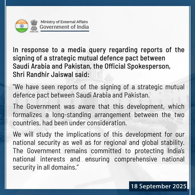 नई दिल्ली: पाकिस्तान और सऊदी अरब के बीच एक रणनीतिक रक्षा समझौता हुआ है। इसके तहत दोनों देश एक-दूसरे पर किसी भी हमले की स्थिति में संयुक्त रूप से जवाब देंगे। इस समझौते पर भारत ने अपनी कड़ी प्रतिक्रिया दी है और कहा है कि वह इस घटनाक्रम पर बारीकी से नजर रखे हुए है और अपने राष्ट्रीय हितों की रक्षा तथा सभी क्षेत्रों में व्यापक राष्ट्रीय सुरक्षा सुनिश्चित करने के लिए सभी आवश्यक कदम उठाएगा।