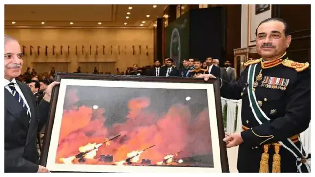 नई दिल्ली: भारत के ऑपरेशन सिंदूर के बाद हर कोई भारत के सैन्य अभियान की तारीफ कर रहा है। इस बीच मुंह की खाने के बाद पाकिस्तान झूठे प्रचार में लगा हुआ है। वो ऐसे दिखा रहा है, मानों उसने कोई बड़ी जीत पाई हो। इसी बीच पाकिस्तान के आर्मी चीफ असीम मुनीर को जब फील्ड मार्शल बनाया गया तो उन्होंने डिनर कार्यक्रम का आयोजन किया था। जिसमें पाकिस्तान के प्रधानमंत्री शहबाज शरीफ के साथ साथ कई बड़े नेता पहुंचे थे। लेकिन इस दौरान पाकिस्तानी सेना के आर्मी चीफ जनरल असीम मुनीर ने शहबाज शरीफ को अपनी शेखी बघारते हुए जो पेंटिंग गिफ्ट की, उसने पूरी दुनिया में पाकिस्तान का मजाक बना दिया है। दरअसल असीम मुनीर ने जो पेंटिंग शहबाज शरीफ को गिफ्ट में दी, वो भारत के खिलाफ पाकिस्तान के हमले का नहीं, बल्कि चीन की सेना की एक आर्मी एक्सरसाइज की है।