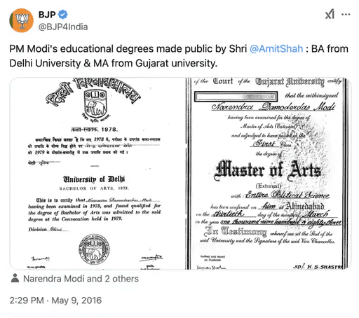 प्रधानमंत्री मोदी ने 2014 के लोकसभा चुनाव में वाराणसी से बतौर उम्मीदवार अपने हलफनामे में यह जानकारी दी थी कि साल 1983 में गुजरात यूनिवर्सिटी से उन्होंने ‘मास्टर ऑफ आर्ट्स’ की डिग्री ली थी। जबकि 1978 में उन्होंने दिल्ली यूनवर्सिटी से बेचलर ऑफ आर्ट्स की डिग्री हासिल की थी।