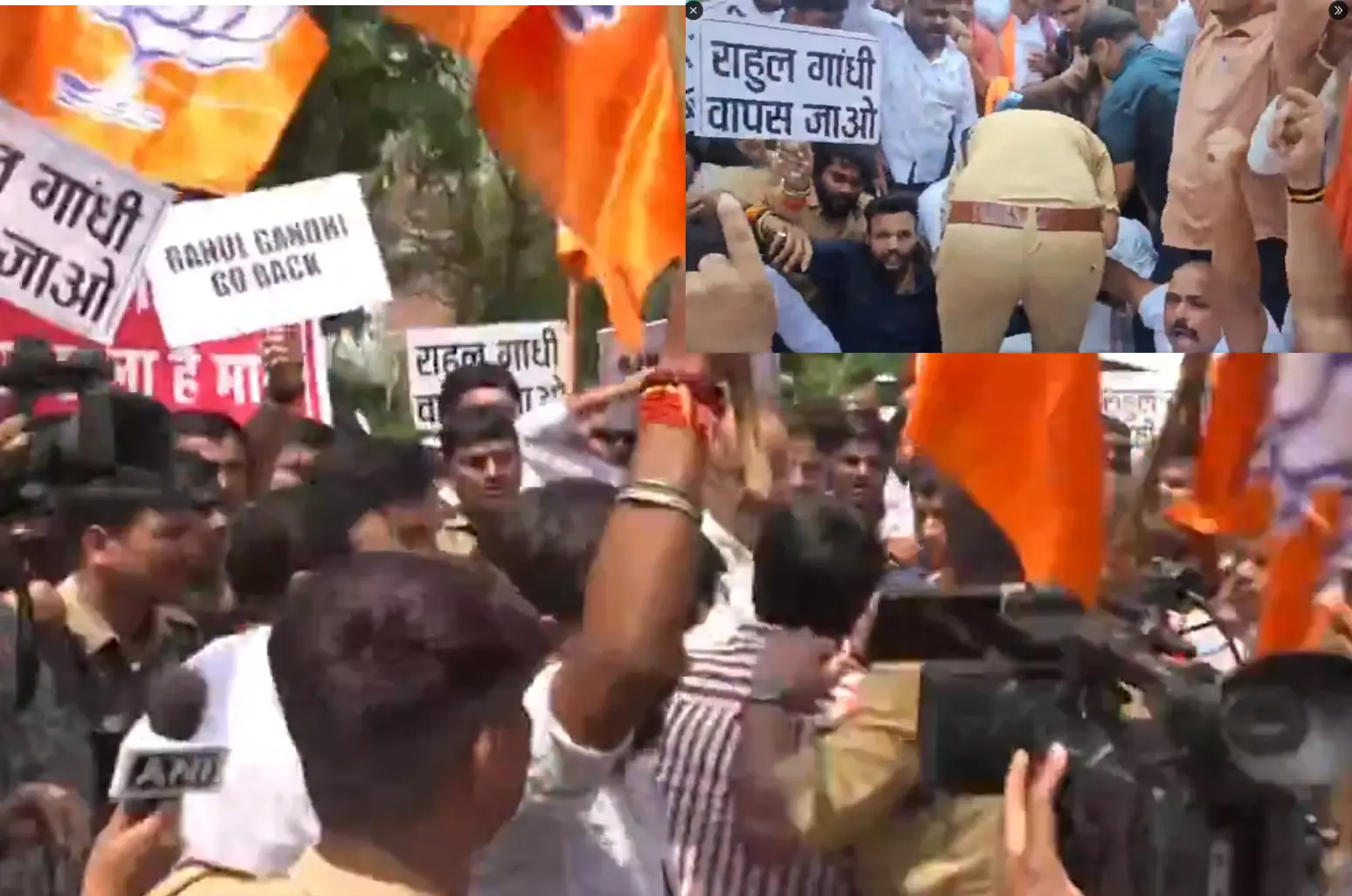 रायबरेलीः कांग्रेस सांसद राहुल गांधी दो दिवसीय यात्रा पर बुधवार रायबरेली पहुंचे। यहां उन्हें भाजपा के विरोध का सामना करना पड़ा। प्रदेश सरकार के स्वतंत्र प्रभार मंत्री दिनेश प्रताप सिंह और उनके समर्थक बटोही गेस्ट हाउस के बाहर रास्ते पर धरने पर बैठ गए और ‘राहुल गांधी वापस जाओ’ के नारे लगाने लगे। भाजपा के इस विरोध की वजह से राहुल का काफिला करीब 1 किलोमीटर पहले ही रोक दिया गया। यह घटना हरचंदपुर थाना क्षेत्र के पास हुई। पुलिस जब दिनेश प्रताप को उठाने पहुंची तो भाजपा कार्यकर्ताओं ने हंगामा खड़ा कर दिया। इस दौर पुलिस से उनकी धक्कामुक्की भी हुई।