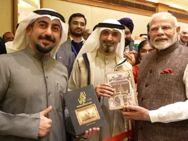 #WATCH | Kuwait | Ramayana and Mahabharata published in Arabic language; Abdullateef Alnesef, the book publisher and Abdullah Baron, the translator of Ramayana and Mahabharata in the Arabic language, met PM Narendra Modi in Kuwait City