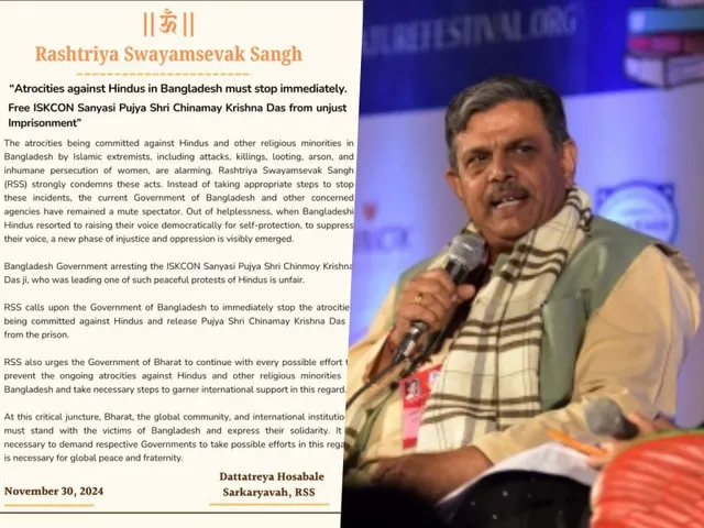 राष्ट्रीय स्वयंसेवक संघ के सरकार्यवाह दत्तात्रेय होसबोले ने 30 नवंबर 2024 को एक बयान जारी करते हुए बांग्लादेश में हो रहे अत्याचारों की निंदा की। बयान में कहा गया, “बांग्लादेश में हिंदुओं पर हो रहे अत्याचार तुरंत रोके जाएं। इस्कॉन के संन्यासी चिन्मय कृष्ण दास को अन्यायपूर्ण कारावास से मुक्त किया जाए।”