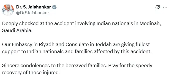 विदेश मंत्री एस. जयशंकर ने पोस्ट करके कहा कि वे इस हादसे से गहरे सदमे में हैं। उन्होंने बताया कि रियाद स्थित भारतीय दूतावास और जेद्दा का वाणिज्य दूतावास प्रभावित भारतीयों और उनके परिवारों की हर संभव मदद कर रहा है। उन्होंने मृतकों के परिजनों के प्रति संवेदना जताई और घायलों के शीघ्र स्वस्थ होने की कामना की।