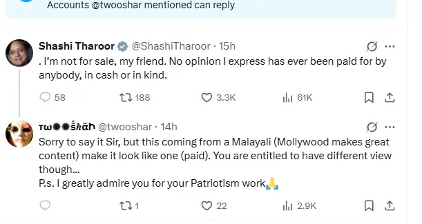 शशि थरूर के इस जवाब के बाद यूजर ने माफी मांगते हुए अपने कहे की सफाई दी। उसने लिखा, क्षमा करें सर, लेकिन एक मलयाली होने के नाते (जहाँ मॉलिवुड बेहतरीन कंटेंट बनाता है), आपका यह बयान थोड़ा ‘पेड’ (पैसे लेकर दिया गया) जैसा लगता है। हालाँकि, आपको अलग राय रखने का पूरा अधिकार है… पुनश्च: मैं आपके राष्ट्रवाद से जुड़े कार्यों का बहुत आदर करता हूँ।