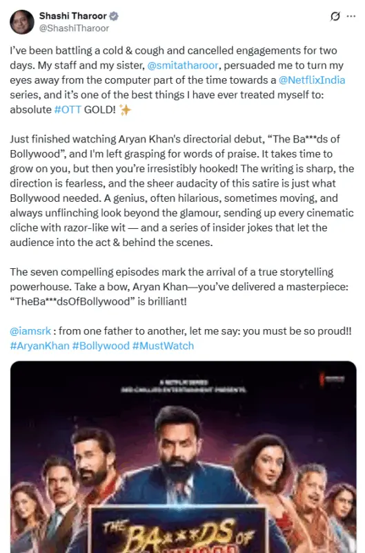 कांग्रेस सांसद ने आर्यन खान के निर्देशन कौशल की खुलकर सराहना करते हुए लिखा, “इसके सात बेहतरीन एपिसोड एक सच्चे कहानीकार के आगमन का संकेत देते हैं। आर्यन खान, तुम्हें सलाम- तुमने एक शानदार काम किया है। द बैड्स ऑफ बॉलीवुड शानदार है। शाहरुख खान, एक पिता के रूप में आपको उस पर गर्व होना चाहिए।”