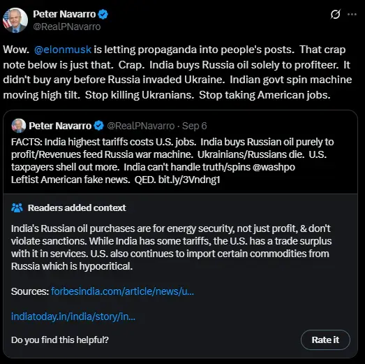 इस पर नवारो भड़क गए और उन्होंने एक्स के मालिक एलन मस्क को भी लपेटे में ले लिए। नवारो ने कम्युनिटी नोट को कचरा बताया। उन्होंने लिखा, एलन मस्क लोगों की पोस्ट में दुष्प्रचार सामग्री आने दे रहे हैं। वह कचरा नोट, बस कचरा है। भारत सिर्फ मुनाफा कमाने के लिए रूसी तेल खरीदता है। यूक्रेन पर रूस के हमले से पहले वह ऐसा नहीं करता था। भारत सरकार की प्रचार मशीन पूरी तरह से काम कर रही है। यूक्रेनियन को मारना बंद करो। अमेरिकियों की नौकरी छीनना बंद करो।