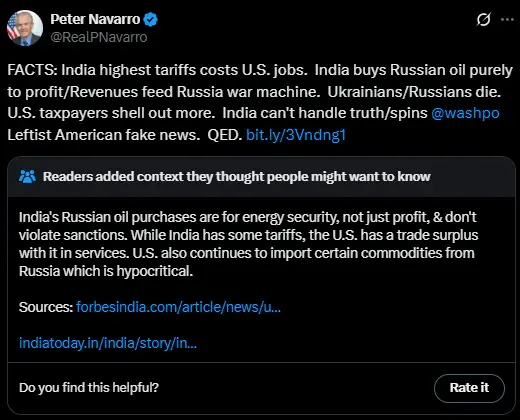 एक्स के कम्युनिटी नोट में कहा गया कि भारत का यह तेल व्यापार ‘ऊर्जा सुरक्षा के लिए है, न कि सिर्फ मुनाफे के लिए’ और यह किसी भी प्रतिबंध का उल्लंघन नहीं करता। नोट में यह भी कहा गया कि अमेरिका खुद भी कुछ रूसी सामान आयात करता है जो ‘पाखंड’ है।